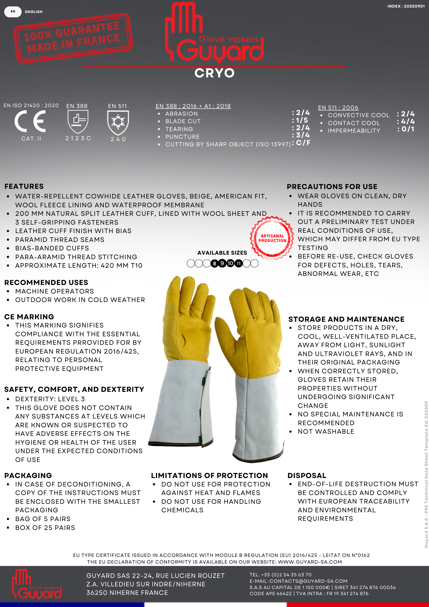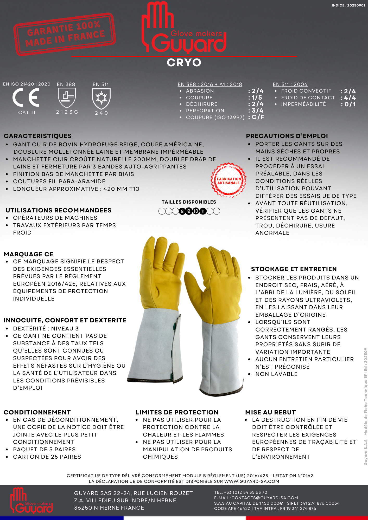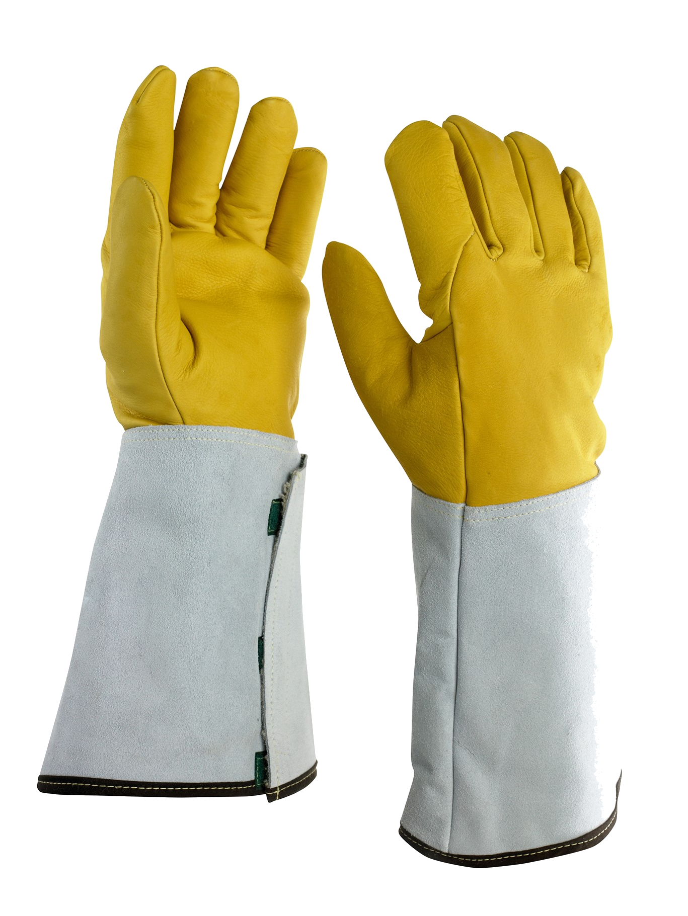 • Manchette cuir croûte naturelle 200mm, doublée drap de laine et fermeture par 3 bandes auto-agrippantes